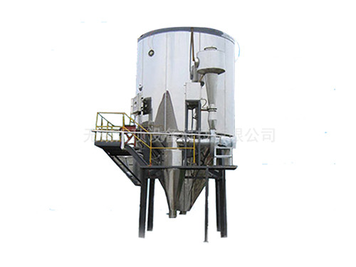 空氣經(jīng)過過濾和加熱進入干燥室,通過2-20MPa的高壓將液料送入壓力式霧化器霧化成小液滴,經(jīng)過霧化后的液滴與熱空氣在干燥室內(nèi)充分接觸,在10-30秒內(nèi)迅速完成干燥過程,得到粉體或細小顆粒的成品。成品連續(xù)地由干燥塔底部和旋風分離器中輸出,廢氣經(jīng)除塵器由引風機排空。